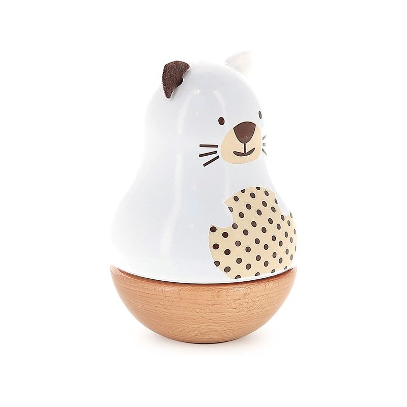 Deze gelakte houten rammelaar, verkrijgbaar als muziekdoos, auto en paraplu, maakt deel uit van een collectie dieren die in ons atelier in de Franse Jura zijn bedacht en gemaakt. Een groep vrienden bestaande uit René de pinguïn, Marcel de beer, Raoul het konijn, Alice de koala, Mariette het poesje en tenslotte Lucien de hond. Voor wie zal jij vallen? Gemaakt in Frankrijk, is dit speelgoed gelakt volgens een uniek proces van onderdompeling in lakbaden die de reputatie van ons atelier in de Jura maakt.