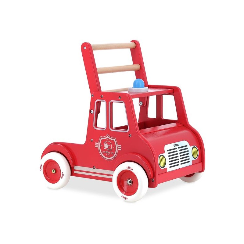 Met zijn vintage brandweerauto-look is deze houten loopwagen ideaal voor de eerste wandelingen van peuters. Met zijn stille wielen en in het laboratorium geteste stabiliteit kunnen kinderen zich veilig voortbewegen terwijl ze op avontuur gaan! Dankzij een remsysteem op de achterwielen kunnen ze in meer of mindere mate worden geblokkeerd, zodat kleintjes de snelheid van hun stappen niet meer zelf kunnen bepalen. Tut tut! Je hoeft alleen maar op de kleine claxon in de vorm van een knipperlicht te drukken om je kleintjes te laten weten dat je er bent!