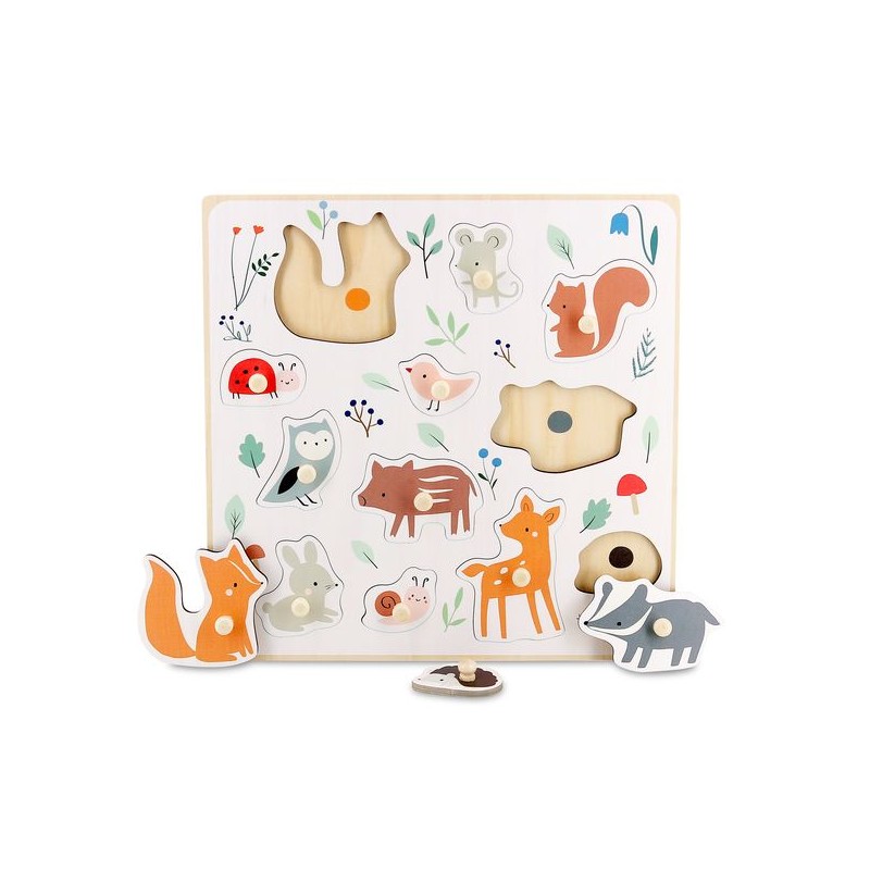 Met houten knijpers die passen bij de kleine handjes van kinderen is deze 12-delige set, poëtisch gedecoreerd door Sarah Betz, een geweldige manier om kinderen te helpen hun fijne motoriek te ontwikkelen. Reflectie, observatie en vaardigheid worden gestimuleerd door het spel: waar is de vos? De muis? De uil? Kleine gekleurde stippen aan de onderkant van de basis helpen de kleintjes.