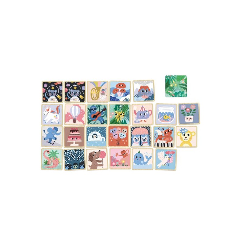 Ontdek onze prachtige Imagier Memo, poëtisch en lief geïllustreerd door Michelle Carlslund: een geheugenspel dat kinderen zal helpen hun woordenschat en hun geheugen te verrijken om de 24 paren te reconstrueren! Vind de vos die piano speelt, de koala in de sterren, de twee ijsberen onder hun paraplu's, en nog veel meer! Een leuke en stimulerende leerervaring voor kinderen vanaf 2 jaar. Duurzaam houten speelgoed met 48 stukjes, gepresenteerd in een doos.