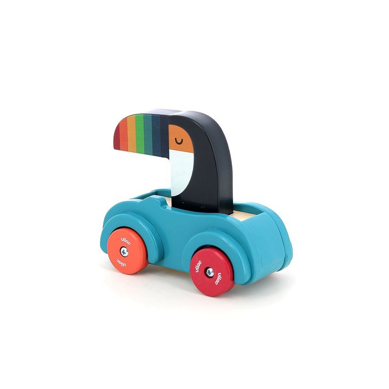 Montessori-speelgoed. Ontdek deze mooie houten auto, ontworpen voor kinderen vanaf 18 maanden en geïllustreerd door Andy Westface. Aan het stuur van deze racewagen zit een ondeugende toekan met zijn kleurrijke snavel. En verrassing! Wanneer uw kind op de kop van de toekan drukt, maakt hij een grappig 'piep piep'-geluid. Dit geluidsdetail wekt de interesse van peuters en biedt hen directe interactie met het speelgoed. De auto is perfect aangepast aan kleine handen en is daardoor gemakkelijk te besturen. Ontwikkeling van fijne motoriek en coördinatie. Door met de auto te spelen en op de kop van de toekan te drukken, traint uw kind zijn/haar fijne motoriek. Deze eenvoudige gebaren dragen bij aan de ontwikkeling van de handspieren en de hand-oogcoördinatie. Door de auto te duwen, te laten rollen en op de toekan te drukken om het geluid te horen, wordt het vermogen van het kind om met zijn omgeving te interacteren versterkt. Dit soort activiteiten helpen bij de ontwikkeling van essentiële vaardigheden voor toekomstig leren, zoals schrijven. Zintuiglijke stimulatie en creativiteit. Onze houten auto met toekanbestuurder is niet alleen een leuk speeltje, maar stimuleert ook de zintuigen van uw kind. Het "piep piep" prikkelt zijn gehoor, terwijl de levendige kleuren van illustrator Andy Westface zijn blik boeien. Ook interactie tussen geluid en beeld stimuleert nieuwsgierigheid en de wens om te ontdekken. Naast het stimuleren van de zintuigen, stimuleert dit speelgoed ook rollenspellen, waardoor het kind avonturen kan bedenken met de leeuw achter het stuur, wat de creativiteit en verbeeldingskracht van het kind versterkt. Dit educatieve speelgoed is ideaal om uw kind te begeleiden bij zijn ontdekkingen en biedt hem tegelijkertijd interactieve, leuke en leerzame speelmomenten. Een kleurrijk universum. Deze houten auto is prachtig versierd door kunstenaar Andy WESTFACE. Sinds 2021 werkt hij met ons samen en hij biedt een kleurrijk en poëtisch universum. Als freelance illustrator zorgt hij ervoor dat kinderen met zijn creaties groeien en dat hun kamers vrolijker worden.