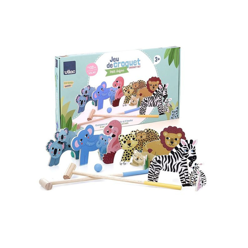 Traditioneel houten spel. Houten croquet is een traditioneel spel dat veel voordelen biedt voor uw kind. Het bevordert de fysieke activiteit: bij croquet moet je lopen, rennen en ballen nauwkeurig slaan, wat helpt bij de ontwikkeling van de hand-oogcoördinatie en de grove motoriek. Uw kind leert omgaan met de hamer en mikken op de hoepels in de vorm van dieren, wat zijn of haar behendigheid en vaardigheid stimuleert. Deze buitenactiviteit moedigt hem aan om tijd buiten door te brengen en deze leuke momenten te delen met zijn vrienden of familieleden. Vele voordelen voor ons houten croquet. Naast de vele fysieke voordelen heeft ons houten croquetspel ook een belangrijke educatieve dimensie. Het zal inderdaad geduld en samenwerking aanmoedigen. Uw kind moet op zijn/haar beurt wachten, zich aan bepaalde regels houden en met andere spelers samenwerken om een ??gemeenschappelijk doel te bereiken. Hierdoor ontwikkelt hij zijn vermogen om eerlijk te spelen en conflicten constructief op te lossen. Bovendien kan ons houten spel een geweldige manier zijn om basisprincipes van wiskunde te introduceren, zoals punten tellen. Een heel zachtaardig universum. Deze houten croquetset is liefdevol versierd door kunstenares Michelle CARLSLUND. Het maakt al jaren deel uit van de VILAC-familie en biedt een zachte en elegante wereld. Als freelance-illustrator laat ze zich inspireren door alles om haar heen. Haar creaties zijn teder en poëtisch en haar kinderlijke en gestileerde wereld past perfect bij die van ons speelgoed.
