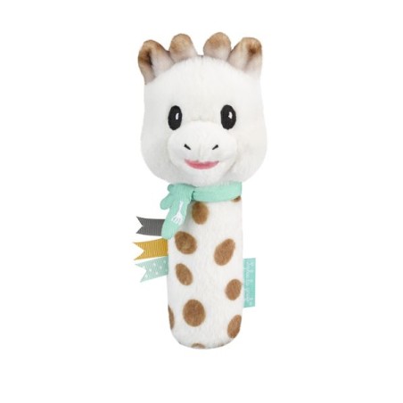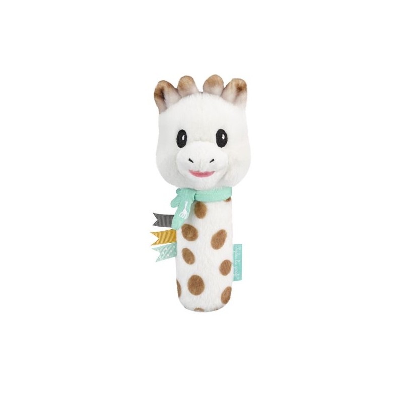 - "belletjes" functie: dankzij de microballetjes in Sophie's hoofd. Gemakkelijk te grijpen en te knijpen door de kleine handjes. De geborduurde sjaal en de 3 gekleurde lipjes markeren elk product van het assortiment.