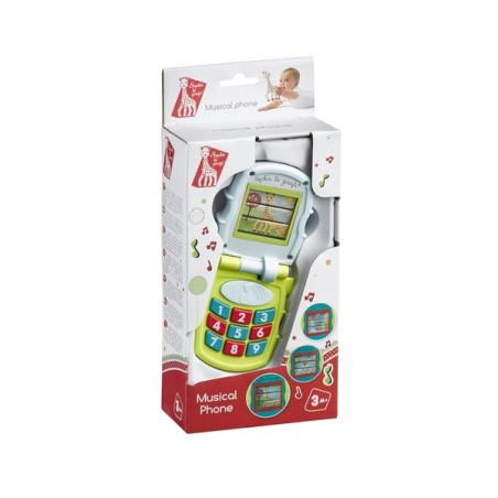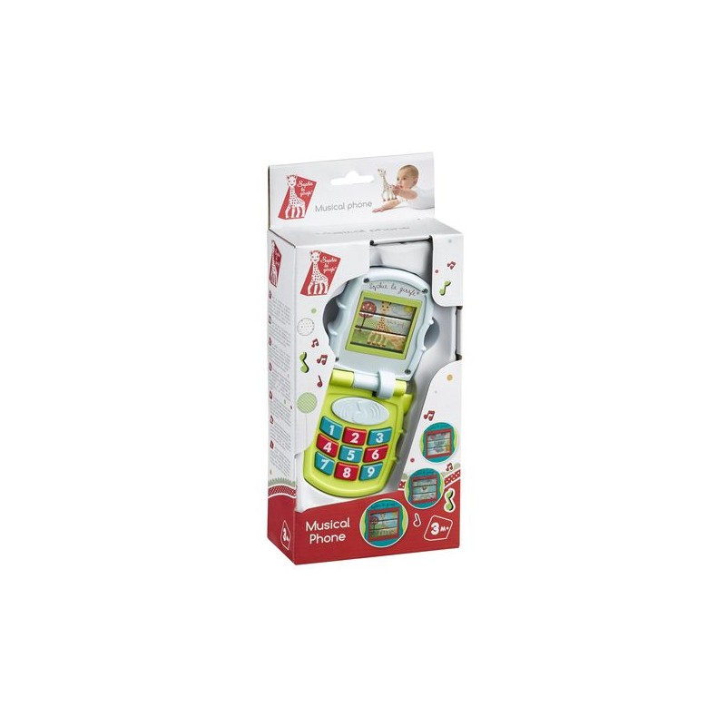 Een muzikale telefoon voor de baby ! Wat leuk om mama en papa te kunnen nabootsen. Leuke kleur iedere keer als je de telefoon openklapt zie je een afbeelding van Sophie de giraf, Josephine de muis of Gabin de beer verschijnen. Oorzaak en gevolg worden op speelse wijze aangeleerd door de mogelijkheid om 5 verschillende melodietjes te activeren door op de grote knop te drukken. Alle kleine knoppen hebben ook ieder hun eigen geluidje.