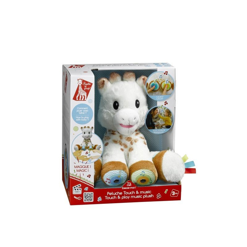 Innovatie op de interactieve pluche markt ! Deze magische pluche is perfect voor momenten tussen ouders en baby ! Raak de twee sensoren op Sophie's pootjes tegelijkertijd aan met uw vingers, handen, voeten of neus om een muzieknoot te activeren. Bij elk nieuw contact van de twee delen met de huid worden de noten getriggerd en volgen ze elkaar op om een melodie te vormen. Als je hem langer dan 3 seconden vasthoudt, wordt de hele melodie automatisch geactiveerd. Met deze sensorische en muzikale knuffel kan de hele familie met baby spelen door elkaars hand vast te houden en de sensoren aan elke kant vast te houden ! Batterijen: 3xAAA inbegrepen.