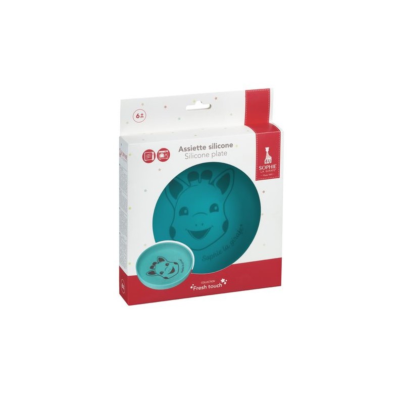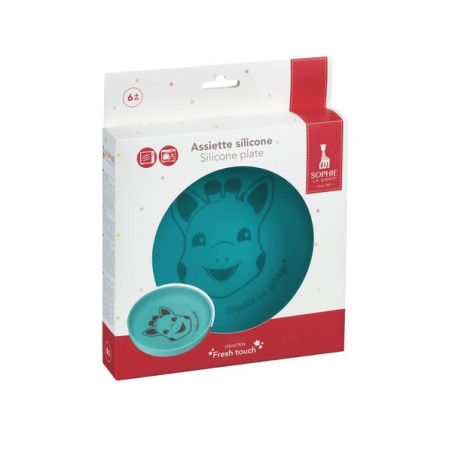 Een prachtig blauw bordje met de afbeelding van Sophie de giraf! Het bordje is gemaakt van 100% siliconen. Hierdoor is het bordje zacht, antislip en onbreekbaar. Het bordje is vaatwasser- en magnetronbestendig.
