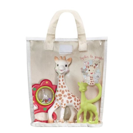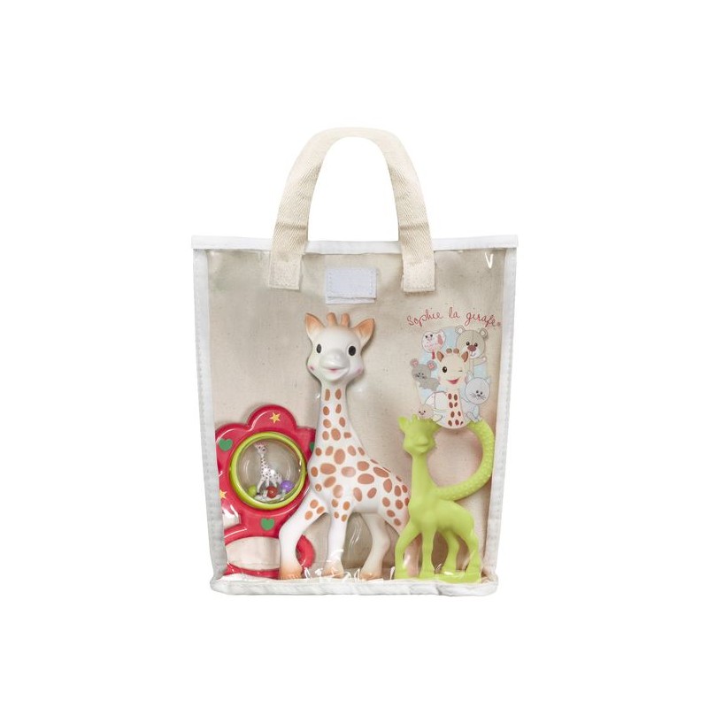 Mooi Sophie de giraf cadeautasje. Dit tasje is gevuld met baby's 3 favoriete producten: Sophie de giraf, Sophie de giraf rammelaar en Vanille bijtring. Verpakt in een mooi katoenen geschenktasje met groot handvat en klittenband om makkelijk open en dicht te doen.
