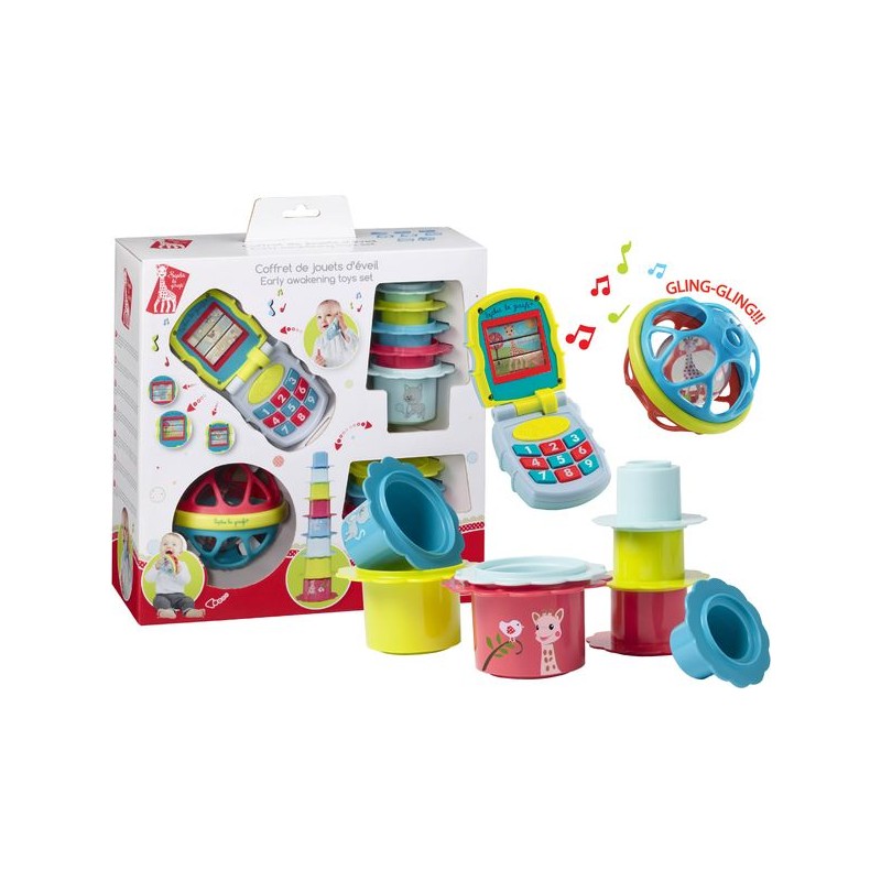 De early learning toys set is ideaal om je baby te entertainen! Deze set bestaat uit een muzikale telefoon, rammel speelbal en stapelbloemen. De muzikale telefoon: iedere keer als je de telefoon openklapt zie je een afbeelding van Sophie de giraf, Josephine de muis of Gabin de beer verschijnen. De kleurven veranderen op het ritme van de muziek. Er zijn 5 verschillende melodietjes die je kan activeren door op de grote knop te drukken. Alle kleine knoppen hebben ook ieder hun eigen geluidje. De rammel speelbal bal die de zintuigen van jouw baby stimuleert. Leuk om naar te kijken, vast te pakken, te rollen, om naar toe te kruipen, leuk om te zien en voor de allerkleinste handjes goed vast te pakken. Als de bal rolt, hoor je de balletjes en zie je Sophie de giraf in het midden ronddraaien. De stapelbloemen bestaan uit acht kleurrijke bloemvormige blokken met daarop mooie patronen van Sophie de giraf en al haar vriendjes. Er zijn tal van verschillende manieren om met deze leuke blokken te spelen die helpen in verschillende stadia van de ontwikkeling van de baby. De patronen op de blokken helpen om baby's verbeelding te stimuleren en hem aan te moedigen om eigen verhalen te verzinnen.