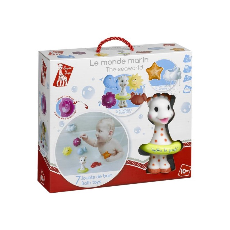 Badtijd wordt een waar plezier met deze badset! De set bevat 7 stukken: 1 water spuitende Sophie de giraf: gemakkelijk manipuleerbaar door de kleine handjes. 2 gieter-badspeeltjes met zuignap: een zeester en een wolk. 4 waterspeeltjes met zuignap: de inktvis, krab, walvis en zon kunnen als waterspuiters worden gebruikt. Baby ontdekt het leven in de zee dankzij zijn nieuwe oceaanvrienden die je na gebruik aan de badkuip kunt plakken.