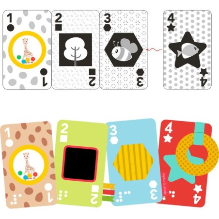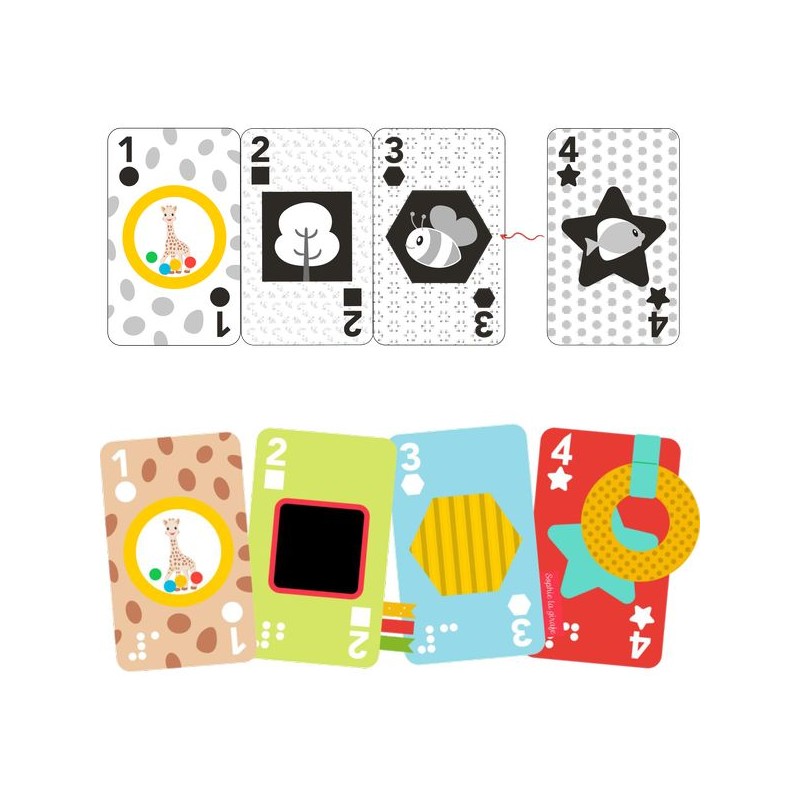 4 onafhankelijke kaarten ontworpen om de aandacht van je kleintje te trekken. De kaarten passen gemakkelijk in elkaar met klittenband, zodat baby zijn eigen zintuiglijke plaatje kan maken. Ons kaartspel bevat braille, wat een verrijkende en inclusieve ervaring is voor iedereen. Een verscheidenheid aan activiteiten om baby te helpen zich te ontwikkelen: felle kleuren, verschillende materialen, een bijtring om op te kauwen, verfrommeld papier, een "pieper" en een spiegel om baby's nieuwsgierigheid te stimuleren terwijl hij plezier heeft. Machinewasbaar op 30°.
