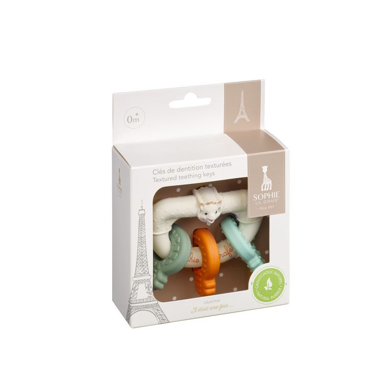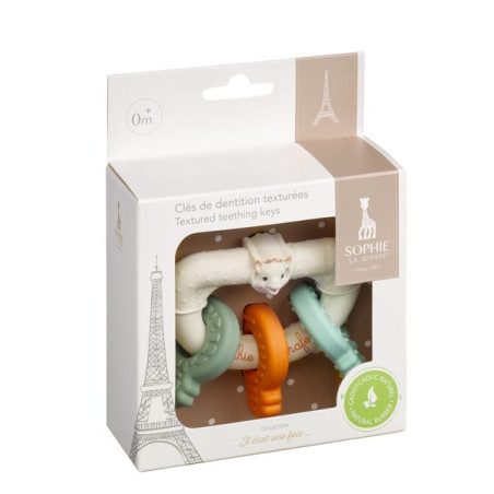 Bijtring van 100% natuurlijk rubber en uitgerust met 3 gekleurde en getextureerde sleutels om op te kauwen om de pijn van het tandvlees van de baby te verlichten.