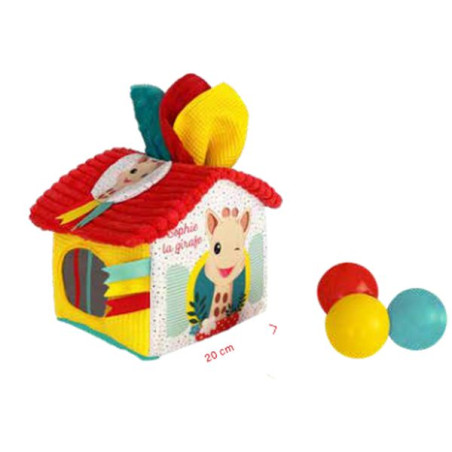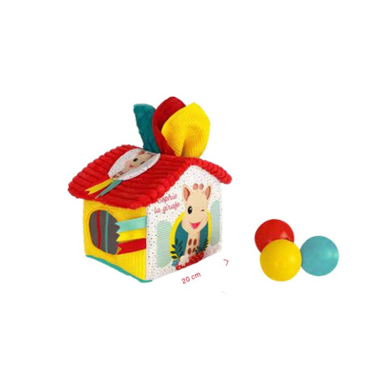 Baby steekt zijn hand door de gaten in het dak van het huis of door de ramen met elastieken en ontdekt:- 3 gekleurde ballen, waarvan één met knikkers,- 3 getextureerde stoffen doekjes, waarvan één met papier- Een kleurrijk huis met verschillende materialen.